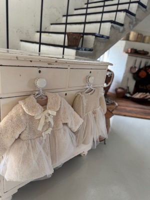 -上品なベルベットテクスチャーに、繊細なレースとチュールディテールを重ねたプレミアムスーツ。ふんわりとしたレースフリルとベルベットリボンが視線を惹きつけ、チュールスカートを重ねたボリューム感のあるシルエットが愛らしさを引き立てます。お宮参りやバースデー、記念撮影など特別な日にぴったりのフォーマルウェアです。